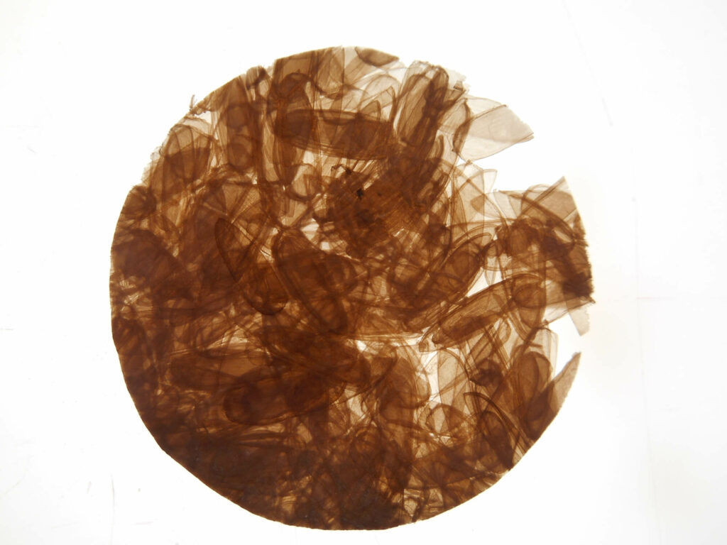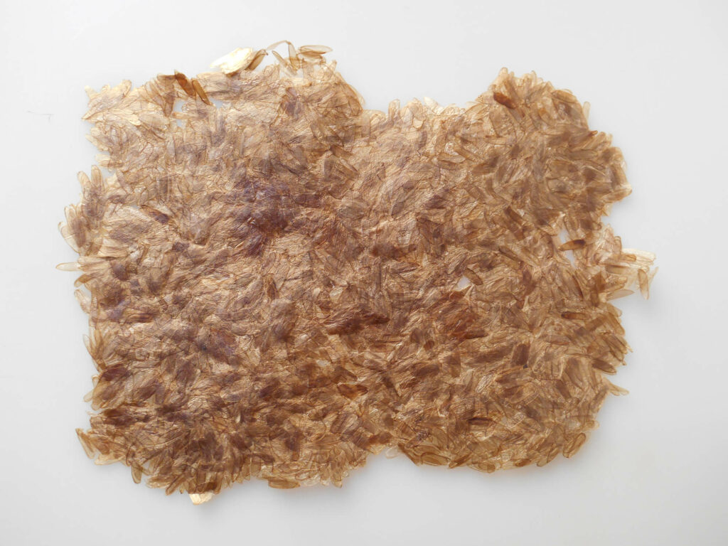 In the Netherlands, mealworms are cultivated for the animal feed industry. The mealworm beetle dies several months after laying eggs. Growers see these beetles as waste and discard them. In order to reduce waste and reuse natural resources, Hoekstra examined how the beetles could be given a second life. Hoekstra peeled the insects by hand, leaving only the wing cases. In a laboratory, she converted these wing cases into pure chitin and then into chitosan, a polysaccharide with some medicinal and industrial applications. Pressing the chitosan results in a material Hoekstra dubbed Coleoptera – a bioplastic made from insect wing cases. Over 2500 beetles were needed for one small sheet of this natural plastic, which Hoekstra made into jewellery and lamps.
