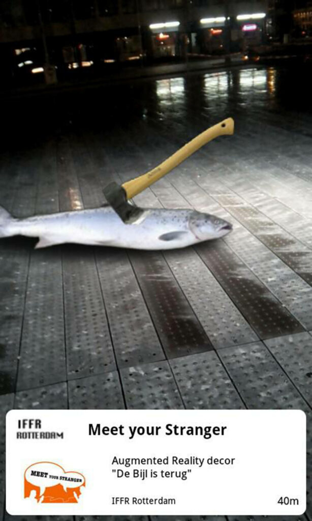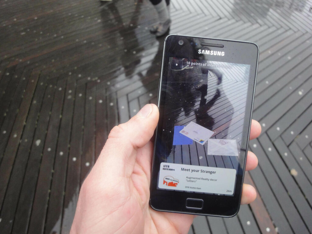 At the 2012 International Film Festival Rotterdam, Freyssen, Veenhof and Bloemendaal produced and performed Meet Your Stranger, an interactive film experienceperformance in public spaces around Schouwburgplein in Rotterdam. Using dialogue texts that appeared on their smartphones, IFFR visitors stepped into the play. They experienced several movie scenes in the midst of AR sets. No physical production took place; the smart technology provided the scenery and the spatial theatrical experience, with human interaction and creation providing the necessary step from the screen to the plaza. Meet Your Stranger is an ongoing project that has crossed over into the Covid-19 era.