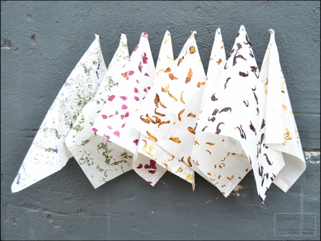 In the province of North Holland, where the majority of the world’s tulips are grown, thousands of hectares of tulips are decapitated in May – the value lies in the bulb, not the bloom. Tulip growers have traditionally discarded the tulip heads. Tjeerd Veenhoven developed a process he called No-ink, wherein he dried tulip heads in a large rotating drum and removed the stems and pistils, leaving just the petals. Veenhoven then laminated the petals with a low-quality, compostable Polylactic acid film. In doing so, he developed a new, aesthetically pleasing and durable material.