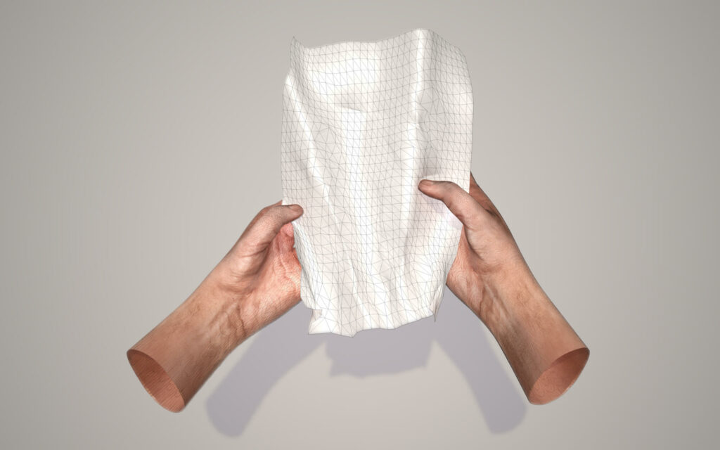 The world of materials is bigger than the material world. Using algorithms, computers can simulate the natural characteristics of materials. For his project Virtual Paper, Borgart used an algorithm developed by the University of California at Berkeley to simulate the characteristics of paper. By linking that algorithm to VR glasses and special software, virtual paper can be manipulated with virtual hands in a virtual environment and then even printed in 3D – a digital-to-physical transformation.